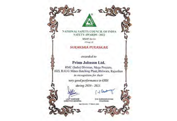 Suraksha Puraskar from the National Safety Council of India, Safety Awards for its Plant in Bhilwara, Rajasthan